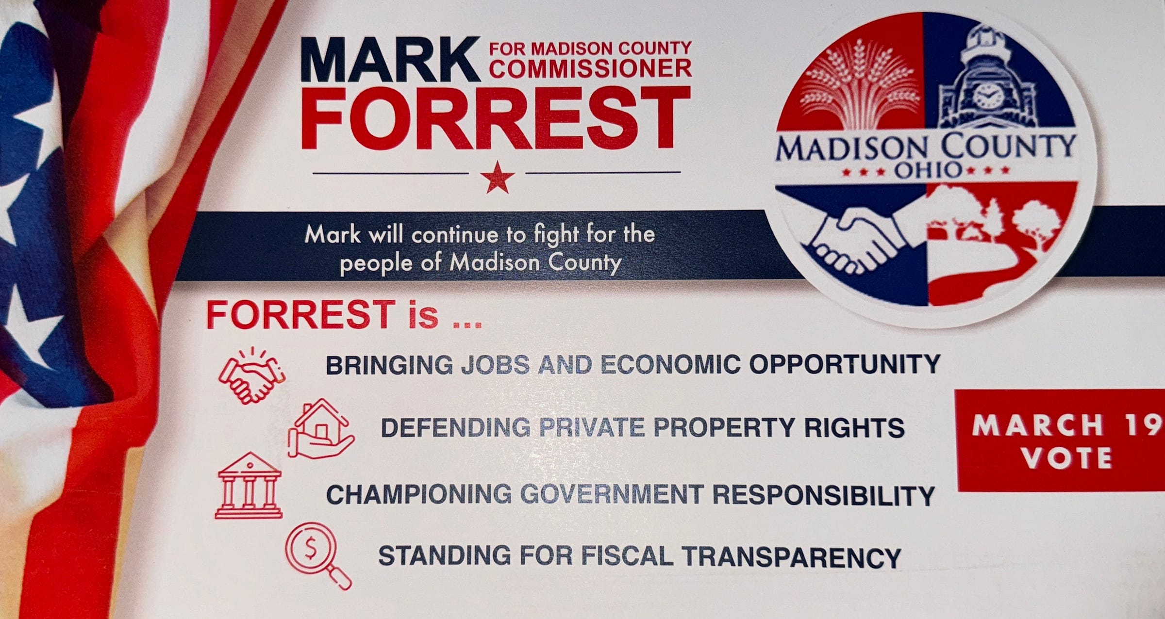 During the 2024 Commissioner primary election, Forrest was running for his fifth term. He was challenged by former local school board member and village councilman Cory Coburn (R-London), who ran a campaign on standard conservative issues (though he later gravitated toward an anti-solar message), and State Board of Education member Brendan Shea (R-West Jefferson), who ran a campaign entirely rooted in solar opposition and worries of degrading the county’s agricultural heritage.
