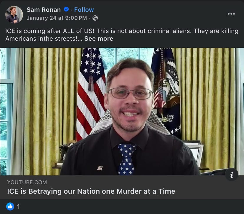 That ideological framing stands in tension with the modern Republican platform. His campaign website reflects the same tension. He has advocated for expansive federal job programs, sweeping economic intervention, and strong opposition to increased ICE funding. His own Facebook post calls Democrats “traitorous” for supporting additional ICE funding, a position that places him at odds with many Republican primary voters.